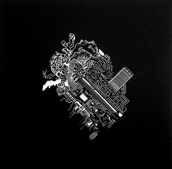 ‘Hybrids’ are series of graphics depicting the metaphorical world of white, delicate cuts, tiny points and organic traces. They generate new, small and harmonious worlds. These worlds tell us a story about man, culture and nature. The presented symbiosis of machines and the world of nature eliminates the boundaries between biology and technology (in other words: between organic and mechanical forms). The worlds create biomechanical hybrids due to the mutual interaction between technology and unspoiled nature.