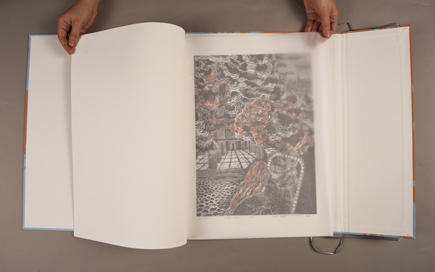 „Szare ziemie/Gray Lands” - is a title for my diploma project, which is based on my own fantasy novel with the same title. My idea was to created a complete, consistent project of book, made by one author. I made a series of 14 illustration, connented do chapters in the novel. They were made as prints, linocuts connected with serigraphy, and presented framed. I've also scanned them and placed in the books, that were also designed by me. My idea was to make two version of the books, based on publishing trends. First is bigger, with good quality paper, colour ilustration with a lot of space. That is the version I would like to publish someday. Second is lowcost version, with recycled paper and only black and white print. All additional elements, and covers were first make with serigraphy, and theme scanned and printed digital. I've also made an book only with oryginal prints, kind of catalouge. In addition to that, I've cut two big linocuts, 170 cm hight, and 270 cm width, also based on the novel. They were printed by hand from one matrix, on cotton canvas.